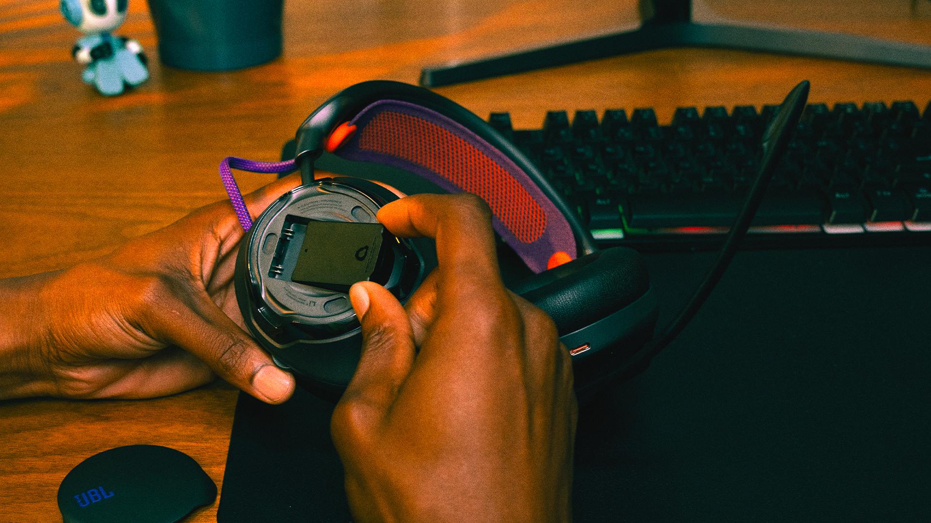 W JBL Quantum 950 Wireless można szybko i łatwo wymienić nie tylko mikrofon i kabel, ale także poduszki nauszne ze skóry ekologicznej oraz siateczkowy pałąk, dzięki czemu zestaw słuchawkowy zawsze będzie wyglądał jak nowy. Wymienne części są sprzedawane oddzielnie i nie tylko umożliwiają naprawę zestawu słuchawkowego, lecz także sprawiają, że jest on bardziej zrównoważony.